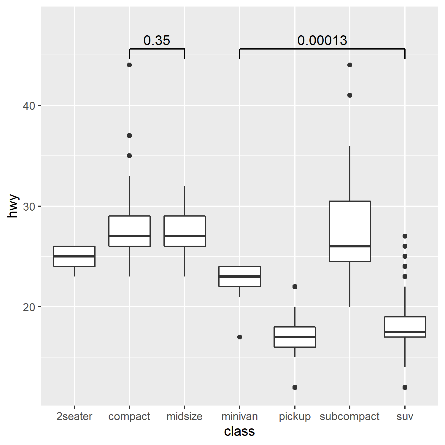 geom_signif(comparisons=list(c("compact", "midsize"), c("minivan", "suv")))